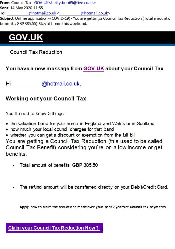 The email, designed to look like it comes from the UK.GOV website, includes a link to claim your “refund” which is designed to extract relevant details from you which could be used to commit additional fraud.