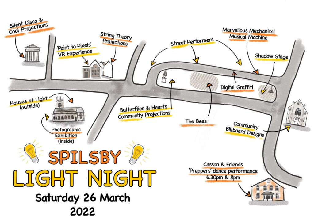The Light Night has been made possible by a grant from Arts Council England along with additional financial support from East Lindsey District Council and Spilsby Town Council, as well as from local businesses Tongs Engineering, Sills & Betteridge and J&A with extra support from Magna Vitae and the SO Festival too.